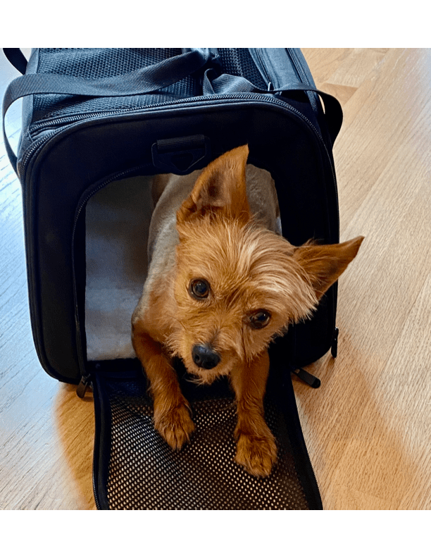 The last time I was away from home for this long, I took Chewy and drove to Montana. The drive was harrowing with a dog who hates the car. Nevertheless, I want to take him with me again. Driving is not an option, so I booked non-stop flights for the two of us from San Francisco to Boston and back. I’ll be in an aisle seat and he’ll be underneath in a soft carrier.