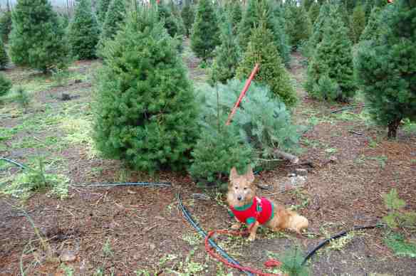 Now Lenore puts that tight sweater on me–ugh–and we go in the car to a little forest. She picks up a long-handled thing with sharp teeth, and we walk among the trees. I smell the blanket of dried needles on the ground, the sappy stumps where trees have once been, and the pee spots left by other dogs. It’s a fun walk, except she’s talking all the time: ” How about this one, Foxy? No, it’s too short. Maybe this one–no, it has a hole in the side. Maybe this one?”